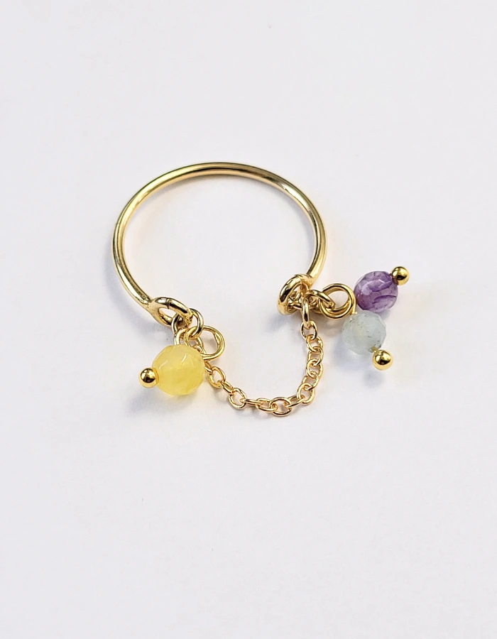 Prsteň z pozlátených komponentov a farebných minerálov.